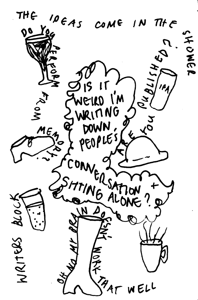 What kind of events? The short answer is, any gathering of humans where you would value an ‘outsider’ to share illustrations, feelings, pieces of conversation and questions from the inside and the margins of the event. I’ve been in this role during the filming of a documentary (which then became part of the film), during a large workshop on collaboration (where I put my illustrations on the wall throughout the event), at a yoga retreat, and many other meetings.