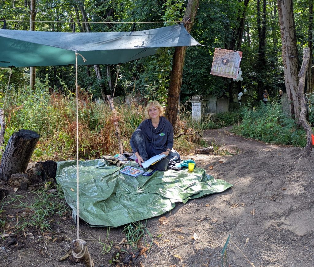 I took part in TRACES festival in Tower Hamlets Cemetery and set up a shelter for humans and creatures to come and have painting conversations with me and join in with mark-making. This was part of my ongoing gallery of conversations.