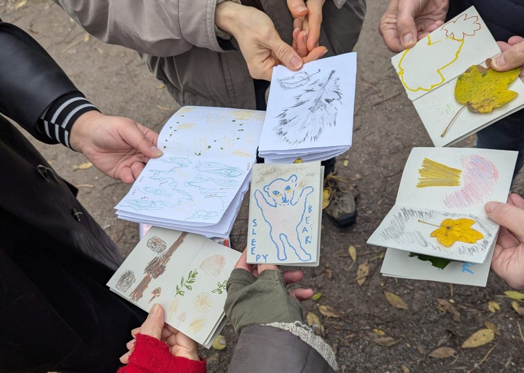 I ran a mindful walk with Rainbow Mind in Tower Hamlets Cemetery. We made a little zine out of recycled paper and I shared prompts to help participants to connect to themselves and to the beautiful woodland around us.
